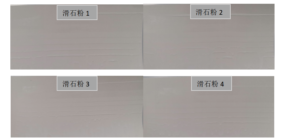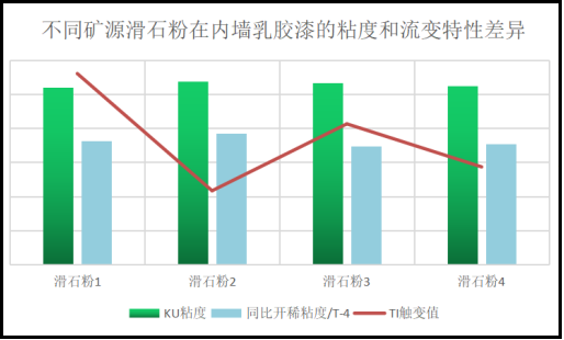 下圖為我司不同礦源的滑石粉在內墻乳膠漆中的對比情況;由下圖可以發(fā)現(xiàn)滑石粉1粘度低,但其具有較優(yōu)異的流變TI指數(shù),說明在配方使用滑石粉1可以使產(chǎn)品具有更寬的施工范圍,以及更優(yōu)異的施工抗流掛性;其他滑石粉則有粘度更高而觸變性更低等的情況。